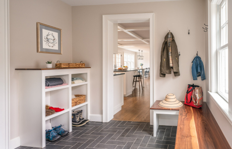What do you need if you own a first period home in Ipswich? A carriage house to match it to hold all of your modern day amenities! From the cobblestone pavers to the custom made transom window this veritable carriage house as garage fits in its space and place in history like no other. A handily made roof over the garage door was constructed to look as if it holds barn door tracks rather than a convenient garage door. The vertical shiplap siding and white cedar shingles; the antique hardware, sourced from the original home, and handmade historic strap hinges on the passage door; the vintage looking casement windows with fifteen simulated divided lights and oversized muntins; and the handsome period color on the shiplap…all nods to the past to make this carriage house fit seamlessly into its surroundings.